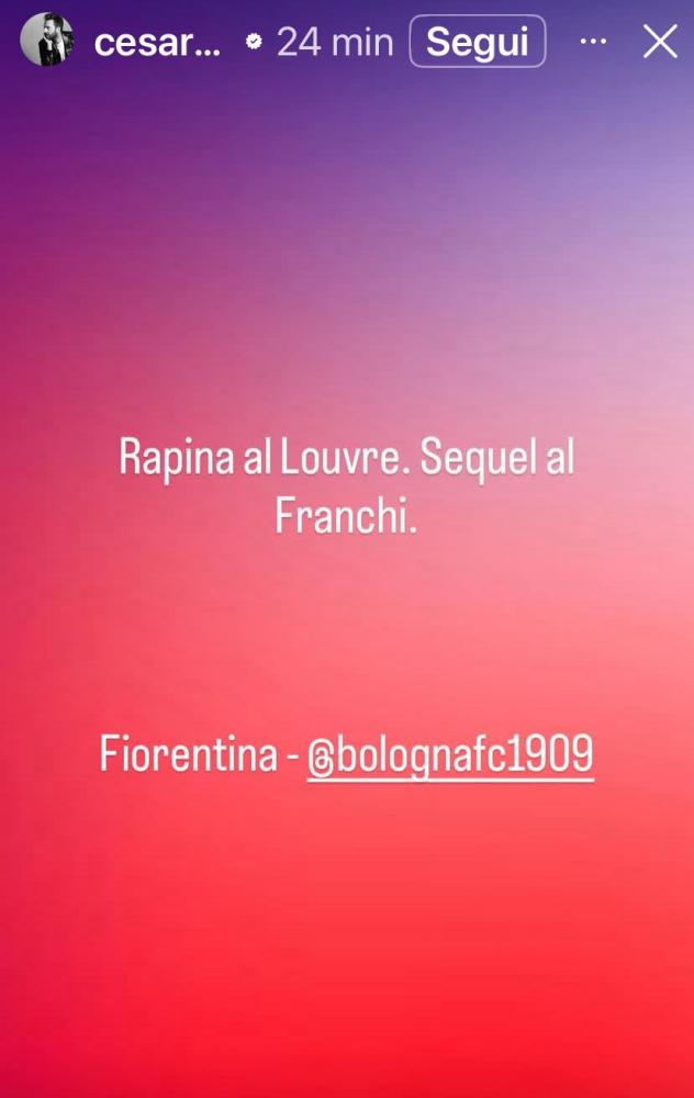 Nella storia instagram in questione Cremonini ha ironizzato sulla situazione definendo quello andato in scena al Franchi come il sequel della nota rapina andata in scena nelle scorse settimane al Louvre. Ecco la storia: