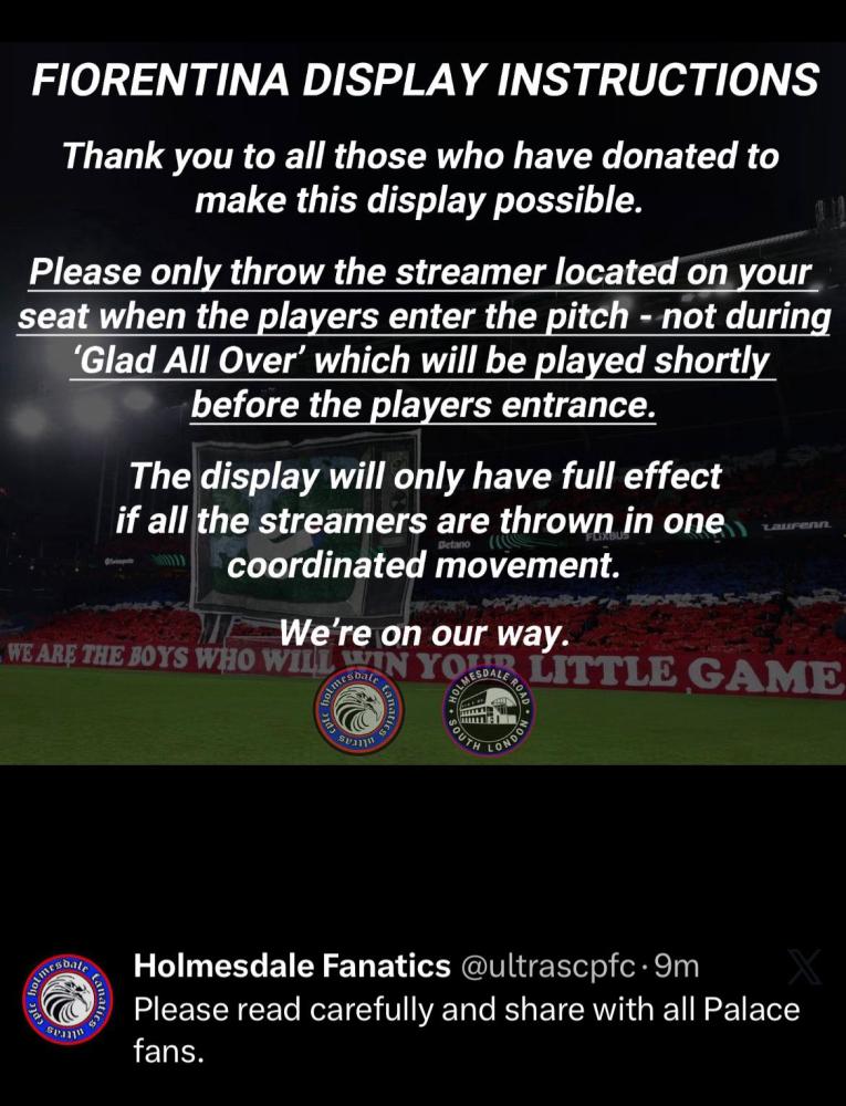 Sarà un Selhurst Park sold out e decorato con una grande coreografia quello che troverà domani la Fiorentina. Lo si evince dall'account Instagram della tifoseria organizzata del Crystal Palace, che tramite i suoi canali ha fornito istruzioni a tutti i sostenitori delle Eagles che saranno presenti domani sera nell'impianto londinese per la coreografia che andrà in scena poco prima del fischio d'inizio. Queste le istruzioni in merito: