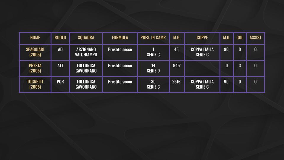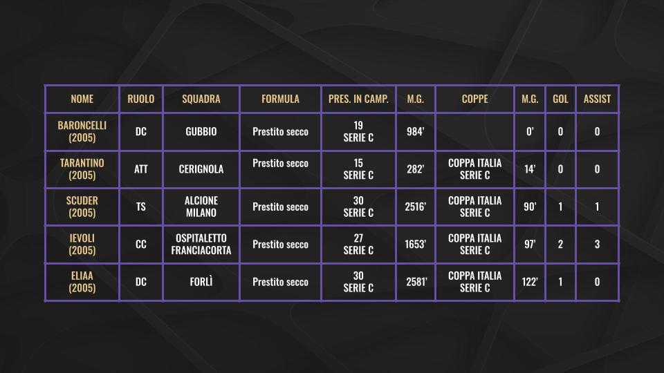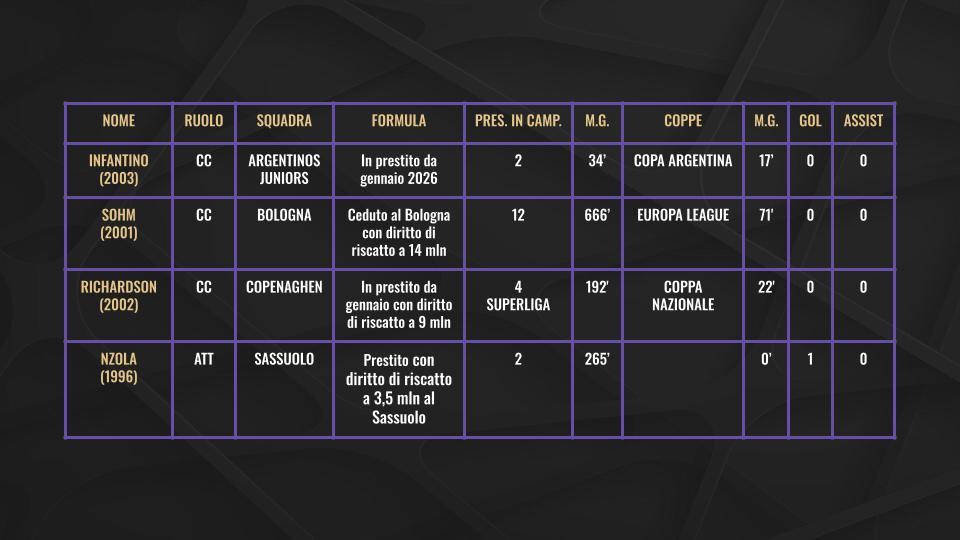 Gli altri 18 invece, tra i quali sono compresi anche Sottil, Beltran, Martinelli e Barak, sono in prestito secco. Queste le grafiche con tutti i nomi, le rispettive situazioni contrattuali, il minutaggio e i gol/assist messi a referto: