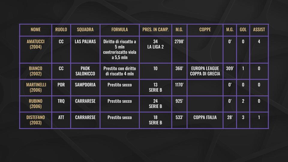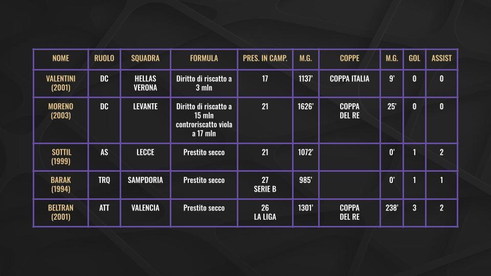 Uno dei temi che dovrà affrontare il nuovo direttore sportivo della Fiorentina, Fabio Paratici, nel corso della sua prima estate a Firenze, sarà certamente quello legato alla gestione dei vari giocatori che rientreranno al Viola Park dai rispettivi prestiti. In totale infatti i giocatori che hanno lasciato la Fiorentina negli ultimi due mercati (estivo e invernale) a titolo temporaneo sono ben 27. Di questi solo 9 sono in prestito con diritto di riscatto: Sohm, Valentini, Amatucci, Infantino (il cui riscatto può diventare obbligatorio in caso di salvezza dell'Argentinos Juniors), Nzola, Richardson, Moreno, Lucchesi (il cui riscatto può diventare obbligatorio in caso di promozione in Serie A del Monza) e Bianco.