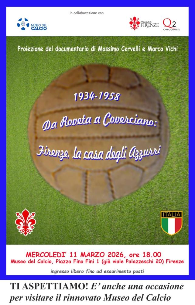 Al Museo del Calcio di Coverciano arriva la proiezione del documentario “1934-1958 Da Roveta a Coverciano: Firenze, la casa degli Azzurri”. Mercoledì 11 marzo alle ore 18.00, presso il Museo del Calcio (Piazza Fino Fini 1), si terrà la proiezione del documentario “1934-1958 Da Roveta a Coverciano: Firenze, la casa degli Azzurri”, a cura di Massimo Cervelli e Marco Vichi, realizzato con la collaborazione del Quartiere 2 Firenze. L’ingresso è libero fino ad esaurimento dei posti disponibili.