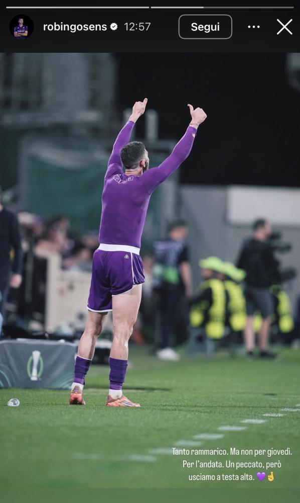 Robin Gosens si è lasciato andare a un piccolo sfogo social due giorni dopo l'eliminazione dalla Conference League per mano del Crystal Palace. Il giocatore ha pubblicato una Instagram Story con scritto: "Tanto rammarico. Ma non per giovedì. Per l’andata. Un peccato, però usciamo a testa alta". Di seguito l'immagine originale diffusa da Gosens sul proprio profilo ufficiale:
