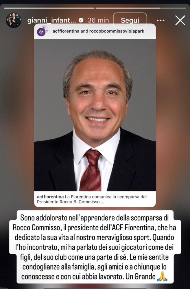 Gianni Infantino, presidente della Fifa, ha ricordato dai social Rocco Commisso, nel giorno della scomparsa: "Sono addolorato nell'apprendere della scomparsa di Rocco Commisso, il presidente della Fiorentina, che ha dedicato la sua vita al nostro meraviglioso sport. Quando l'ho incontrato, mi ha parlato dei suoi giocatori come dei figli, del suo club come una parte di sé. Le mie sentite condoglianze alla famiglia, agli amici e a chiunque lo conoscesse e con cui abbia lavorato. Un grande", il messaggio tramite una Instagram Story.