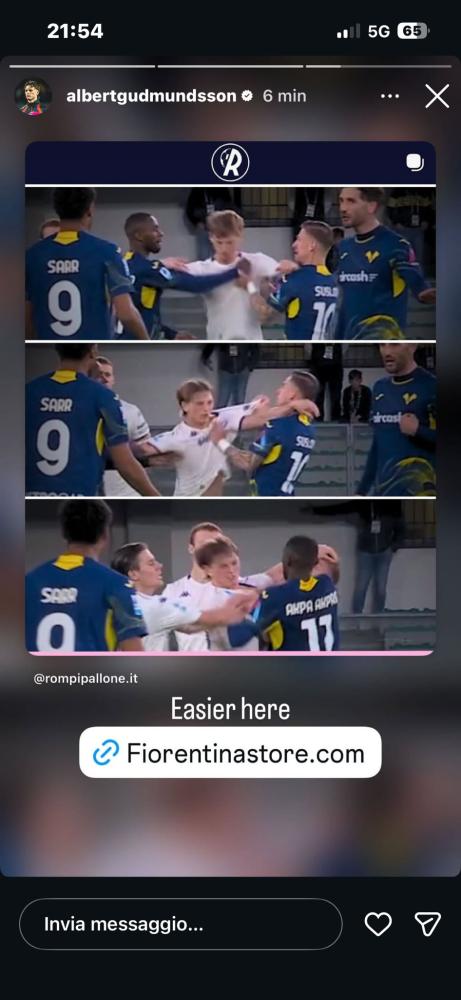 Non si placano gli animi tesi tra Albert Gudmundsson e Suslov dopo Hellas Verona-Fiorentina che ha visto nel finale un parapiglia in campo tra i due giocatori costato il rosso per entrambi. Il numero 10 islandese della Fiorentina sui propri canali social ha ricondiviso i fotogrammi della piccola rissa tra i due calciatori mettendo il link per andare sul Fiorentina Store e dunque acquistare online la maglietta di Gudmundsson. "Più facile qui", il commento dell'attaccante gigliato che evidentemente non ha mandato giù quanto accaduto sul prato del Bentegodi.