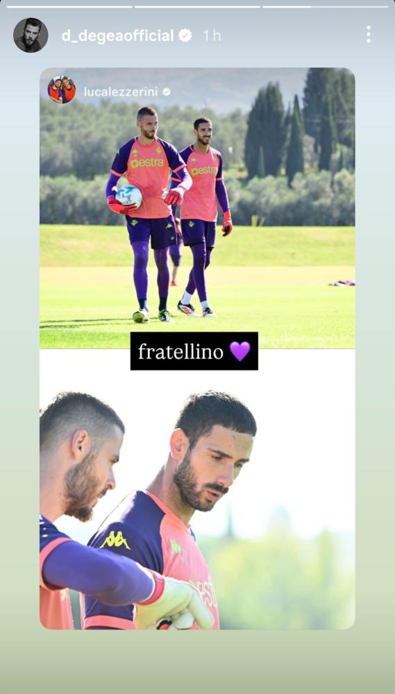 Eletto miglior giocatore del mese di settembre della Fiorentina, David De Gea prova a smorzare un po' gli animi anche nello spogliatoio attraverso i social. Lo fa ripubblicando due foto messe dal terzo portiere Luca Lezzerini e aggiungendoci quello che evidentemente è il soprannome scelto dall'estremo difensore spagnolo per il compagno. "Fratellino" con un cuore viola, ha scritto De Gea sul proprio account Instagram.