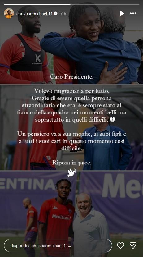 Tra i tanti ricordi e pensieri per Rocco Commisso, c'è anche quello di Christian Kouame che con parole dolci ha voluto salutare il presidente della Fiorentina: "Caro Presidente - ha scritto Kouame in una storia Instagram - Volevo ringraziarla per tutto. Grazie di essere quella persona straordinaria che era, è sempre stato al fianco della squadra nei momenti belli ma soprattutto in quelli difficili. Un pensiero va a sua moglie, ai suoi figli e a tutti i suoi cari in questo momento così difficile. Riposa in pace".