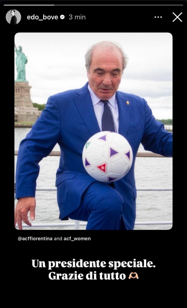 Attraverso una storia Instragram pubblicata pochi minuti fa l'ex centrocampista della Fiorentina, Edoardo Bove, in procinto di tornare a giocare a calcio, con la chiamata sempre più vicina del Watford, dopo il problema al cuore accusato proprio in viola, ha reso omaggio alla scomparsa del presidente gigliato Rocco Commisso: "Un presidente speciale. Grazie di tutto!". Questo il messaggio scritto da Bove nella storia che raffigura Commisso con tra i piedi un pallone.