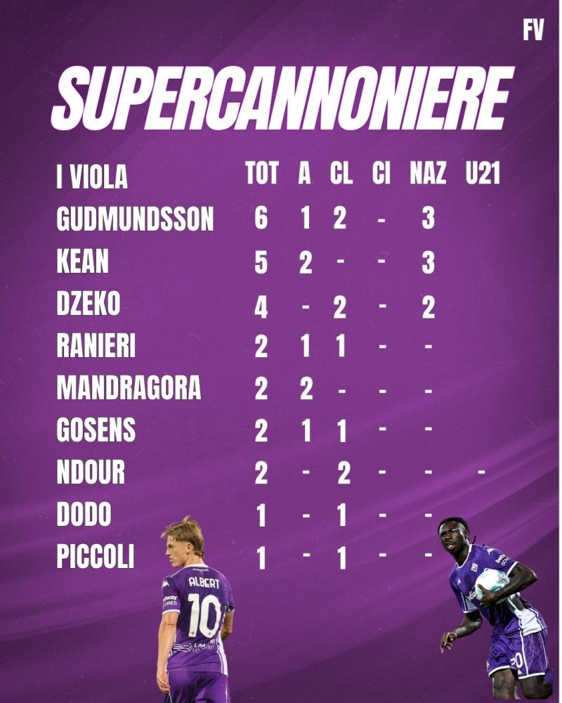 Nella classifica del Supercannoniere Viola, nuova rubrica di questa stagione targata FirenzeViola che tiene conto di tutti i gol segnati dai giocatori della Fiorentina in tutte le competizioni, nazionali e under 21 comprese, Albert Gudmundsson è balzato alprimo posto con 6 reti grazie al rigore segnato contro il Bologna e la rete messa a segno a Vienna in Conference League contro il Rapid. Lo segue a un gol di distanza Moise Kean, anche lui a segno dal dischetto contro la squadra di Vincenzo Italiano. Segue al terzo posto con quattro reti Edin Dzeko, mentre appiati a due gol ci sono Ranieri, Mandragora, Ndour e Gosens.