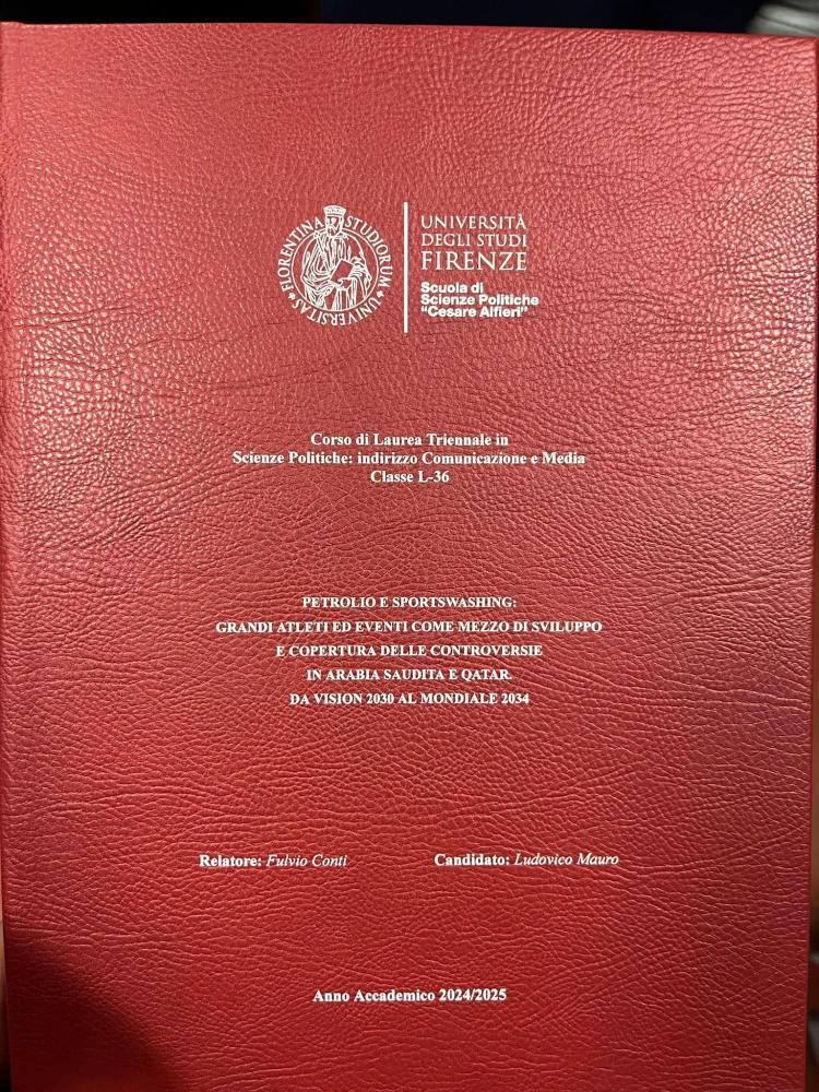 In casa FirenzeViola è giornata di festa, si è infatti laureato il nostro giornalista Ludovico Mauro! Ludovico, che ha frequentato il corso di laurea triennale in Scienze Politiche con indirizzo di "Comunicazione e Media" ha discusso nel pomeriggio la tesi "Petrolio e sportswashing: grandi atleti ed eventi come mezzo di sviluppo e copertura delle controversie in Arabia Saudita e Qatar. Da Vision 2030 al Mondiale 2034". Congratulazione da parte di tutta la redazione di FirenzeViola e Radio FirenzeViola.