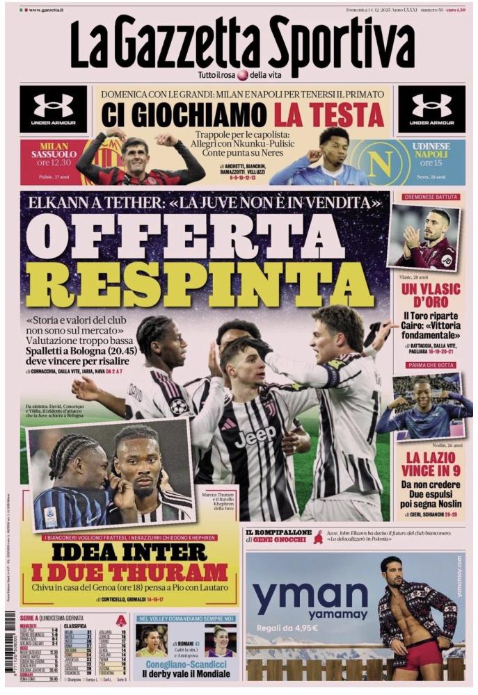 Queste le prime pagine dei quotidiani sportivi in edicola oggi, domenica 14 dicembre 2025.