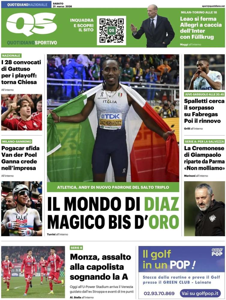 Queste le prime pagine dei quotidiani sportivi in edicola oggi, sabato 21 marzo 2026.