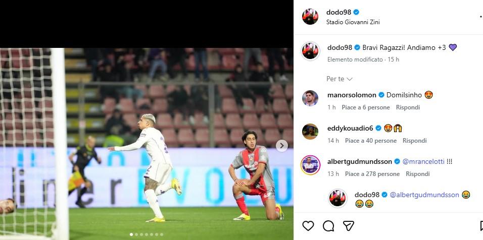 Dodo ieri a Cremona ha vissuto una serata da protagonista, tra i migliori della partita. E come spesso accade il brasiliano ha postato le foto sui social scrivendo "Bravi ragazzi! Andiamo + e il cuore viola". Tra i tanti commenti, ci sono anche i complimenti e il sostegno dei suoi compagni, come quello di Solomon che lo chiama "Domilsinho" per sottolineare il talento da brasiliano (il nome è Domilson).