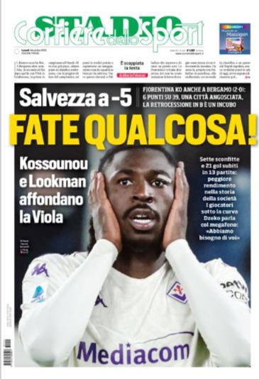Il quotidiano sportivo, nella sua edizione di Firenze, in prima sottolinea il -5 dalla quota salvezza dopo il ko per 2-0 contro l'Atalanta, le sette sconfitte e i 21 gol subiti in 13 partite e di conseguenza il peggior rendimento nella storia del club: 6 punti conquistati su 39 disponibili. La retrocessione in B è un incubo, scrive il Corriere. Ecco la prima pagina: