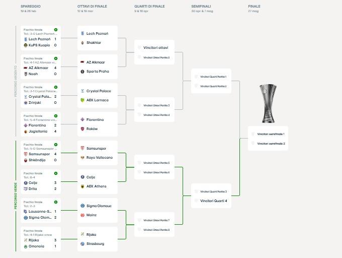 14:16 - La vincente della sfida tra viola e polacchi troverà ai quarti di finale la vincente di AEK Larnaca-Crystal Palace.