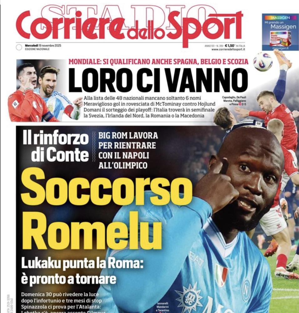 Queste le prime pagine dei principali quotidiani sportivi nazionali in edicola oggi, mercoledì 19 novembre 2025.